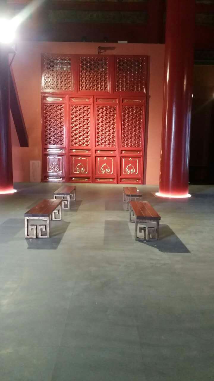 首先在產品的外觀設計上,借鑒故宮建筑群地面青磚的風格和顏色,我們試制出了具有古代風格的仿石材地板表面,遠看上去透射出的風格是樸素的古代天然地磚;其次在產品規格上保持與原來同樣大小的規格;第三在鋪裝工藝上,最底層使用鋼制龍骨框架,其上鋪設20㎜的埃特板(水泥纖維板),鋪實找平后用速干沙漿溝縫找平并砂磨;然后用3㎜厚橡膠卷材打底再次精找平,最后再鋪設仿古橡膠地板塊材,進行無縫隙拼接。地板鋪設完成后,地面的觀感與屋頂、墻壁渾然一體,充分達到了使用方提出的防滑、降噪、防潮、阻燃、復古等各項指標,博到了故宮博物院院長單雯翔先生的高度好評。